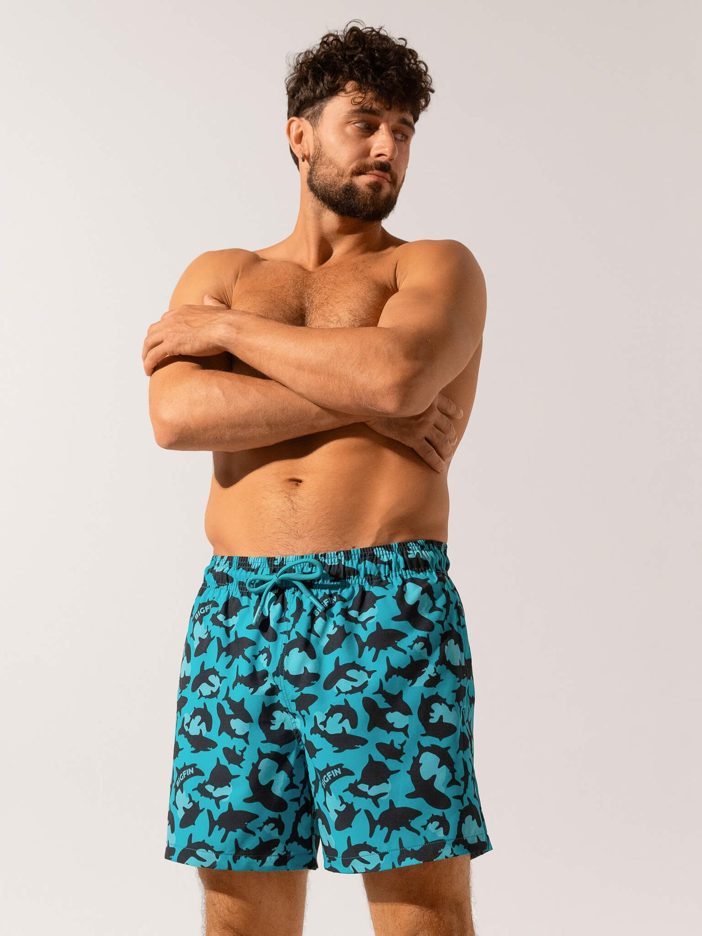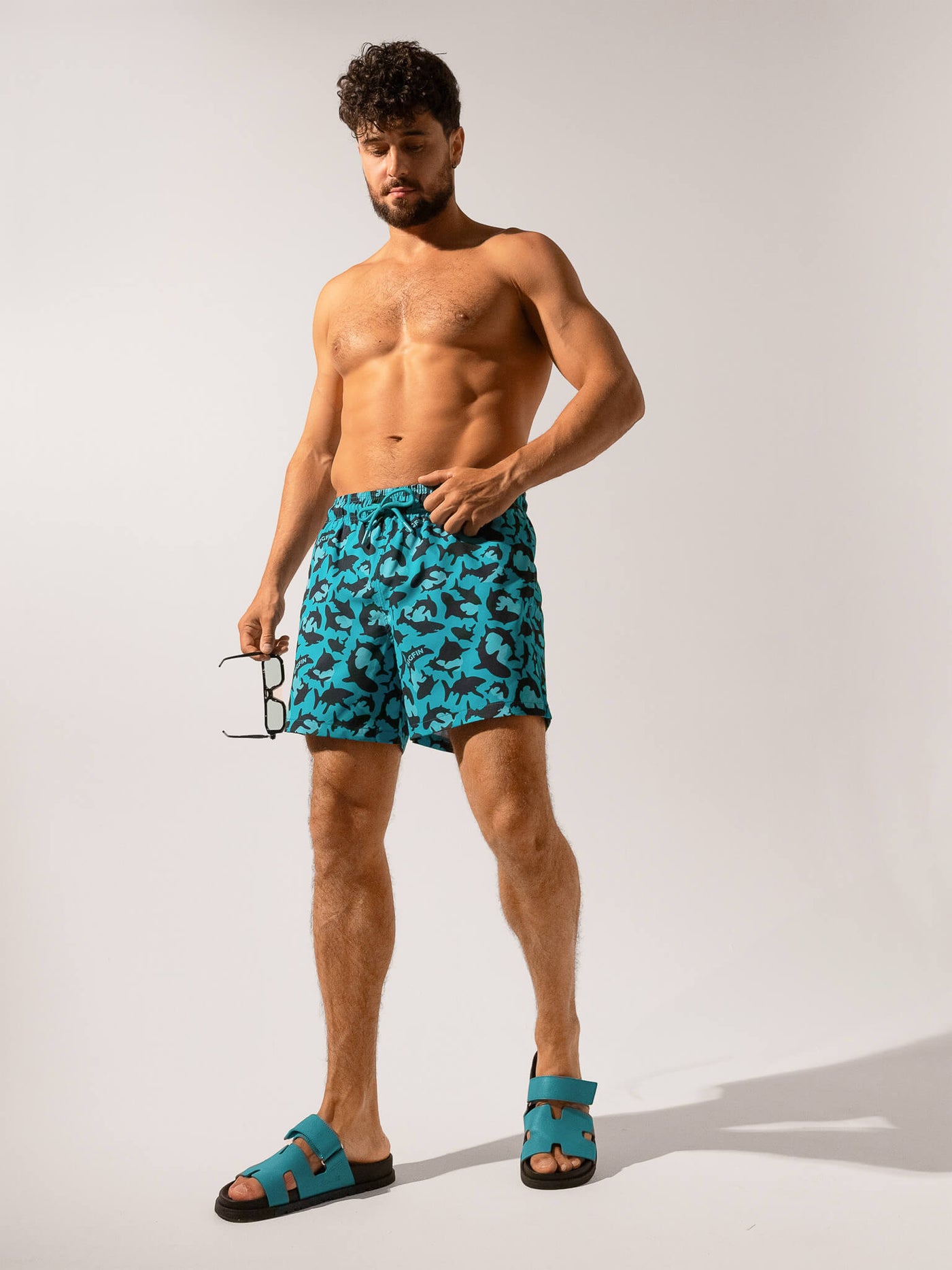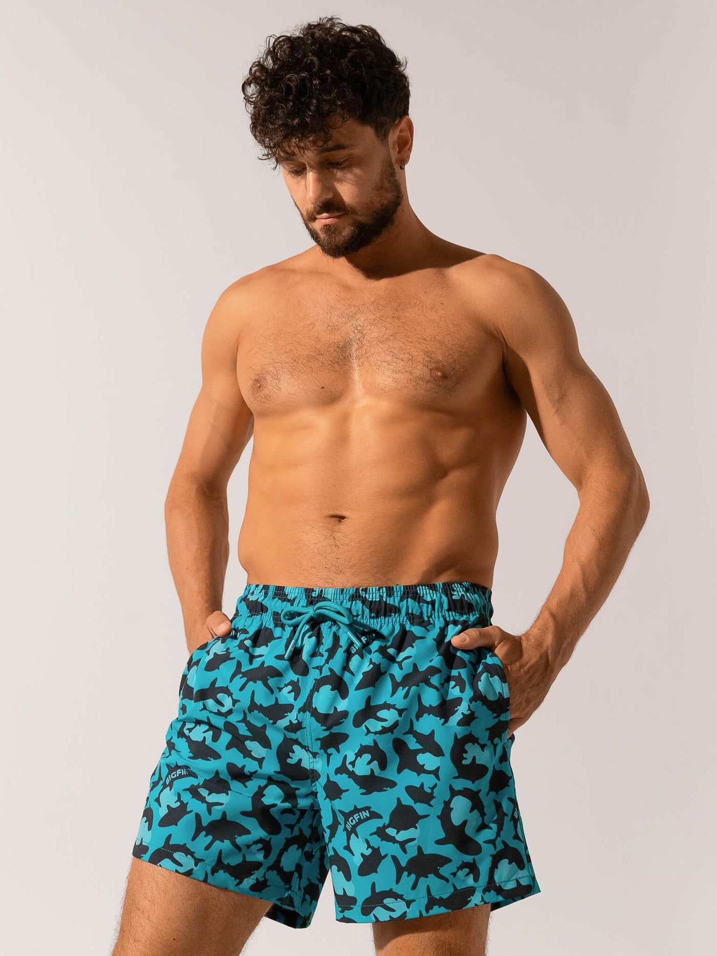 A striking graphic pattern brings a modern, high-energy look that elevates your summer outfit beyond basic swim trunks.
